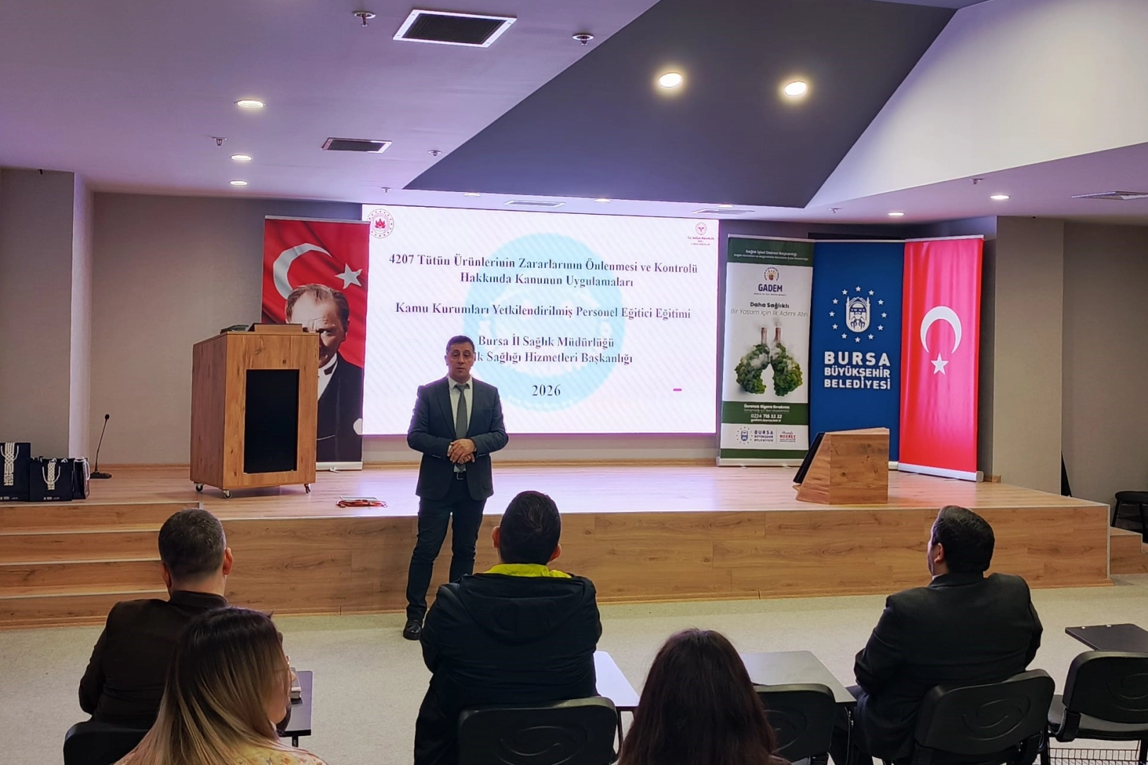 İl Sağlık Müdürlüğü Halk Sağlığı Hizmetleri Başkanlığı Tütün ve Diğer Bağımlılık Yapıcı Maddelerle Mücadele Biriminden sağlık memuru Ramazan Dedekoç bilgilendirme yaparken, Sağlık Hizmetleri ve Bağımlılıkla Mücadele Şube Müdürlüğü tarafından Psikolog Ahmet Hatip de GADEM’in çalışmalardan bahsetti.