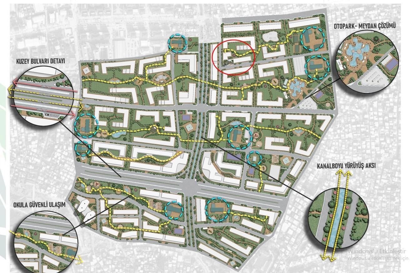 Projede ayrık nizam yerine blok nizam tercih edilerek imar adaları büyütüldü. Bahçe duvarlarının kaldırılmasıyla birlikte kullanılmayan yan bahçeler ve önceki sistemde yol olarak ayrılan alanlar yeşil sisteme dahil edildi. Böylece, büyük yeşil sistem üzerine kurulu imar adaları oluşturuldu. 20-30 hektarlık parçacıl imar adaları uygulanabilir şekilde tasarlandı. Bu adaların çevresi en az 30 metre genişliğinde araç yollarıyla çevrilecek. Parklar, sosyal donatı alanları ve eğitim yapıları kesintisiz yeşil yaya akslarıyla birbirine bağlanacak. Proje sayesinde çocukların okula 1-2 km mesafeyi araç trafiğinden arındırılmış güvenli yaya yollarıyla yürüyerek ulaşması sağlanacak.