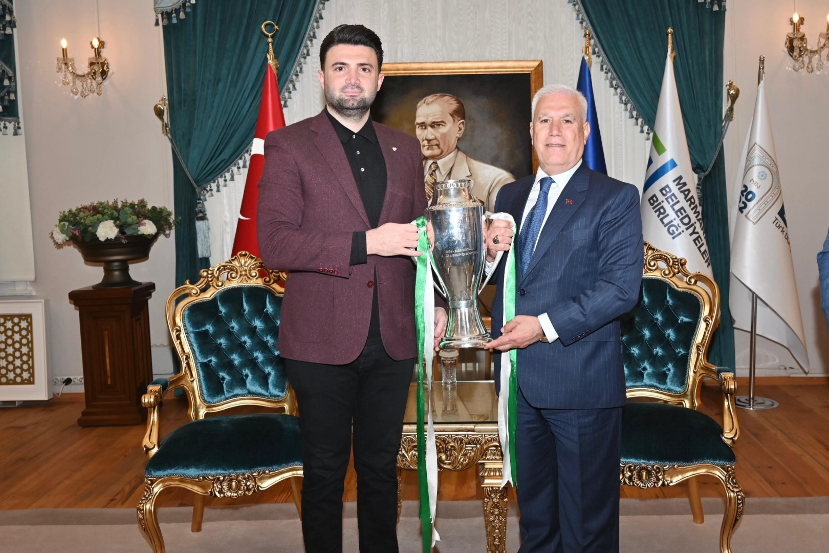 Nesine 3. Lig 1. Grup'ta şampiyonluğa ulaşarak 2. Lig'e yükselmeye hak kazanan Bursaspor’un Başkanı Enes Çelik ve yönetim kurulu üyeleri, şampiyonluk kupasıyla birlikte Bursa Büyükşehir Belediye Başkanı Mustafa Bozbey’i Tarihi Belediye Binası’nda ziyaret eti. Samimi bir ortamda gerçekleşen ziyarette, zorlu bir süreçten geçerek bir üst lige çıkmayı başaran Bursaspor’un yeni hedefleri konuşuldu.