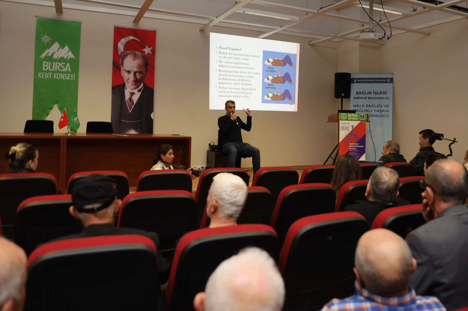 Sağlıklı insan ve sağlıklı kent mottosuyla çalışmalarını sürdüren Bursa Büyükşehir Belediyesi, Pulmoner Rehabilitasyon Haftası kapsamında bir dizi etkinlik düzenledi. İnsan Kaynakları ve Eğitim Dairesi Başkanlığı’na bağlı Personel Geliştirme Şube Müdürlüğü ve Sağlık İşleri Dairesi Başkanlığı’na bağlı Halk Sağlığı ve Sağlıklı Yaşam Şube Müdürlüğü ile Evde Bakım ve Ambulans Hizmetleri Şube Müdürlüğü tarafından hazırlanan program, Merinos Atatürk Kongre ve Kültür Merkezi’nde gerçekleştirildi. Kronik solunum hastalıklarıyla mücadele etmek amacıyla düzenlenen seminerde, solunumun önemi ve doğru solunum tipleri konularında detaylı bilgiler verildi. Fiziksel aktiviteyi artırmayı sağlayacak ve hastalığın ortaya çıkaracağı kısıtlamalarla başa çıkmaya yardımcı olacak solunum egzersizleri de uygulamalı olarak gösterildi.