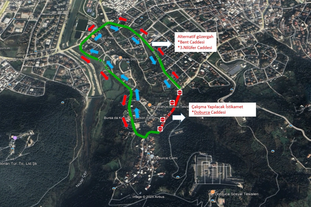 BUSKİ Genel Müdürlüğü İçmesuyu Dairesi Başkanlığı tarafından yapılacak Çınarcık Su Projesi isale hattı çalışmaları kapsamında Osmangazi İlçesi Doburca Mahallesinde Doburca Caddesi üzerinde 200 metrelik güzergahta 04 Temmuz 2025-14 Temmuz 2025 tarihleri arasında ulaşım 3. Kadife Sokak Yolu kesişiminden itibaren 3. Zümrüt Sokak kesişimine kadar trafiğe kapatılacak olup, ulaşım alternatif güzergahlardan sağlanacak.
