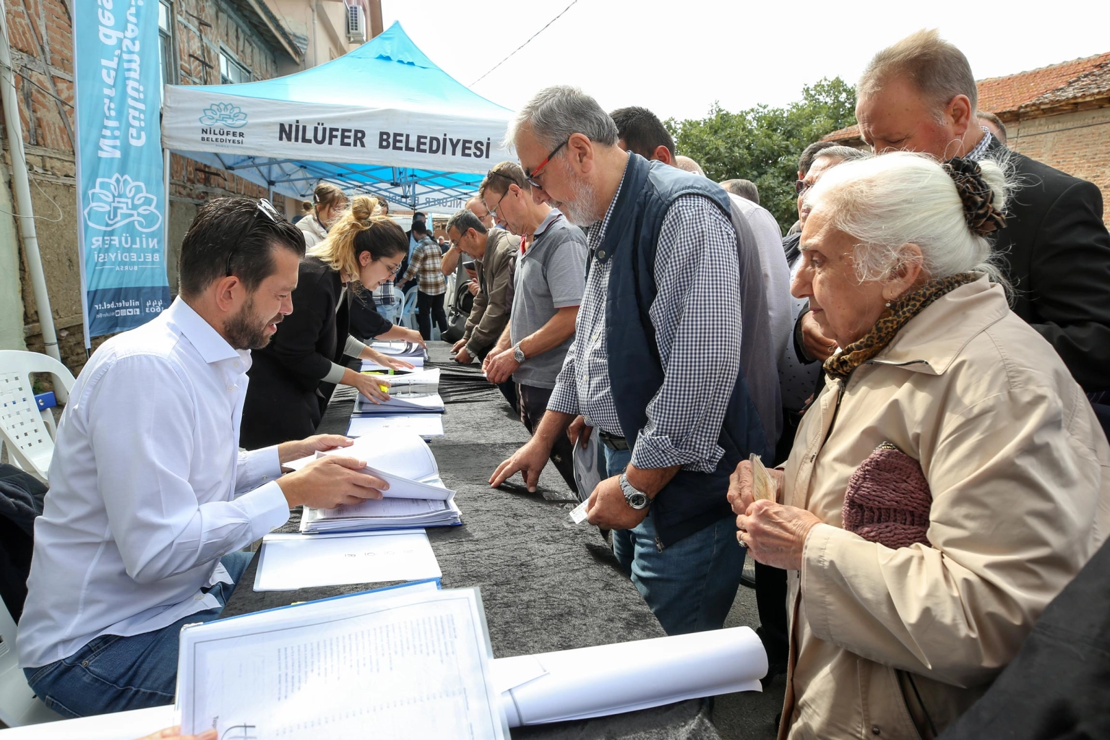 Konuşmaların ardından Nilüfer Belediye Başkanı Turgay Erdem, Doğanköy Mahalle Muhtarı Fikri Araz ile birlikte hak sahiplerine resmi tapularını dağıttı.