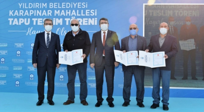 Yıldırım Belediyesi ilçenin en önemli problemlerinden olan hisseli parsel sorununu ortadan kaldırmak için Karapınar'da 2 bin 290 hak sahibini tapu tescil belgelerine kavuşturdu.