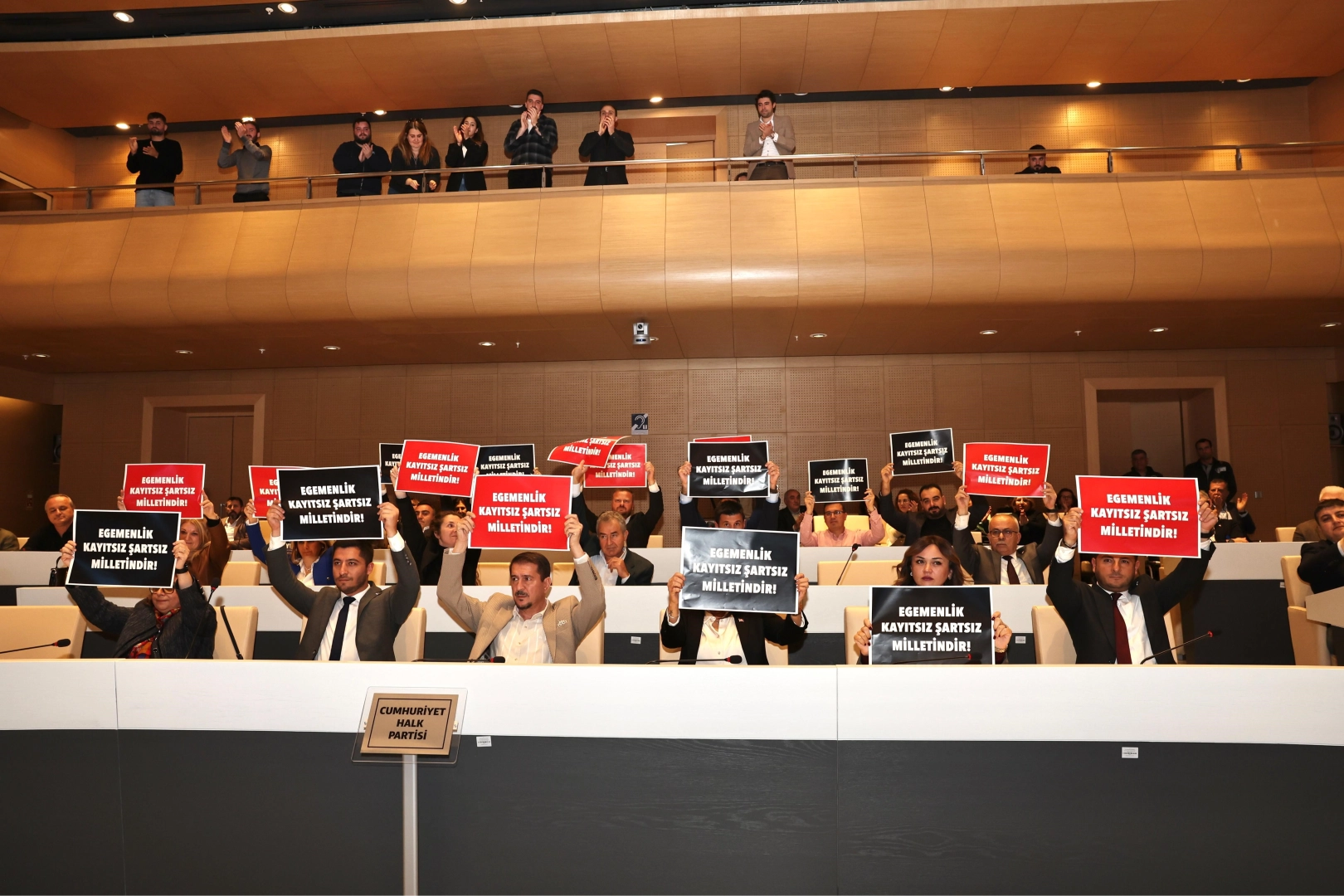 Yücel Akbulut’un konuşmasının ardından CHP’li belediye meclis üyeleri, “Egemenlik kayıtsız şartsız milletindir” yazılı dövizleri açarak alkışlarla kararı protesto etti.