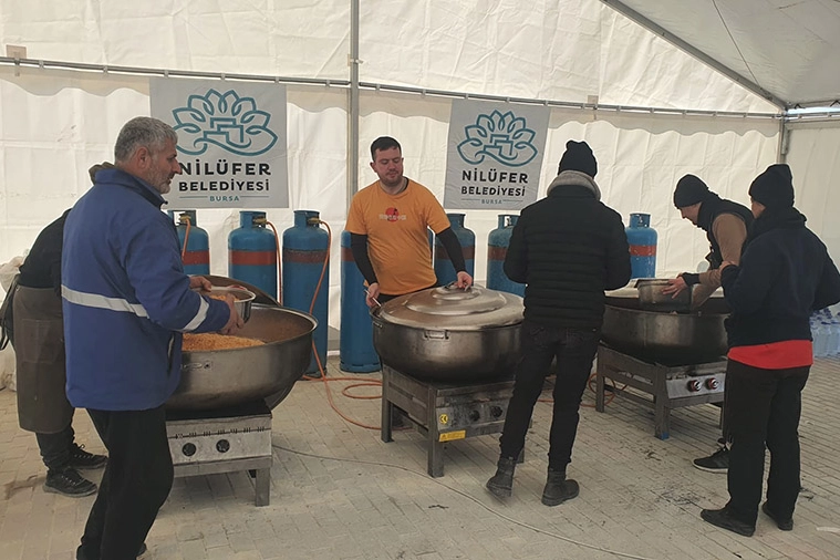 Bölgeye şimdiye kadar 200’ü aşkın yardım malzemesi taşıyan tır gönderen Nilüfer Belediyesi, en acil ihtiyaç olan yemek konusunda da bir çalışma başlattı. Hafta sonunda Hatay’ın Samandağ ilçesinde aşevi kuruldu. 5 aşçı, 6 kurulum ekibi, kaynakçı, elektrikçi ve su tesisatçısıyla birlikte hizmet veren aşevinde sabahları sıcak çorba, öğlen ve akşamları da sıcak yemek dağıtımına başlandı. Atatürk Sahil Parkı’ndaki aşevine gelenlerden isteyenler yemeklerini orada yiyor, isteyenler de kaplarla evlerine götürebiliyor. Nilüfer Belediyesi Başkan Yardımcıları Zafer Yıldız ile Mehmet Temirtaş da aşevinin çalışmalarına katıldı.