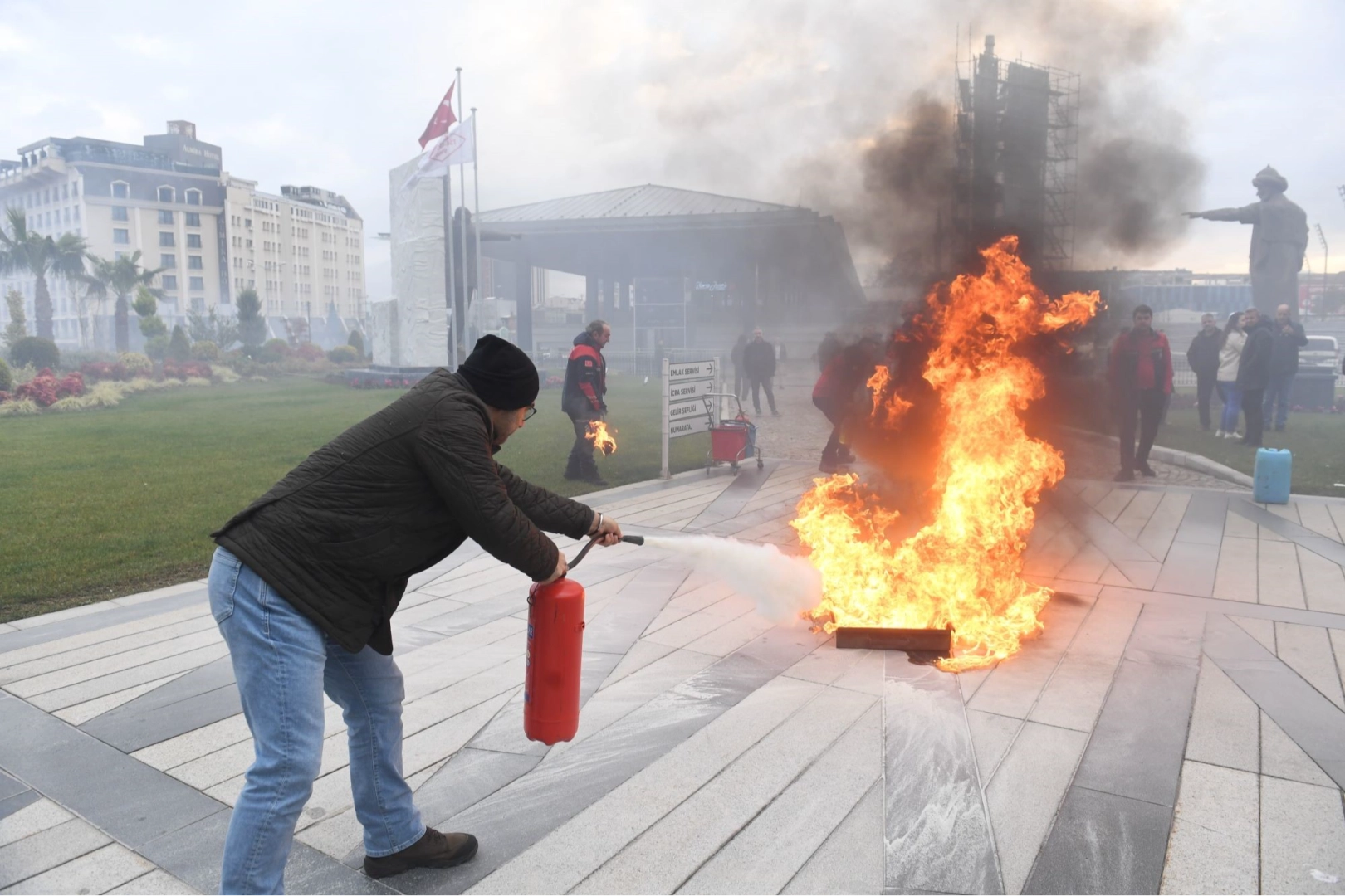 Afet İşleri Müdürlüğü personelinin yönlendirmesiyle Osmangazi Belediyesi merkez binası, 117 saniye gibi kısa sürede tümüyle tahliye edildi. Belediye binasının önünde toplanan personele Afet İşleri Müdürlüğü ekipleri, deprem ve yangın anında neler yapması gerektiğini uygulamalı olarak gösterdi. Ardından yakılan ateşe, doğru şekilde yangın söndürme tüpüyle nasıl müdahale edilmesi gerektiği anlatıldı.