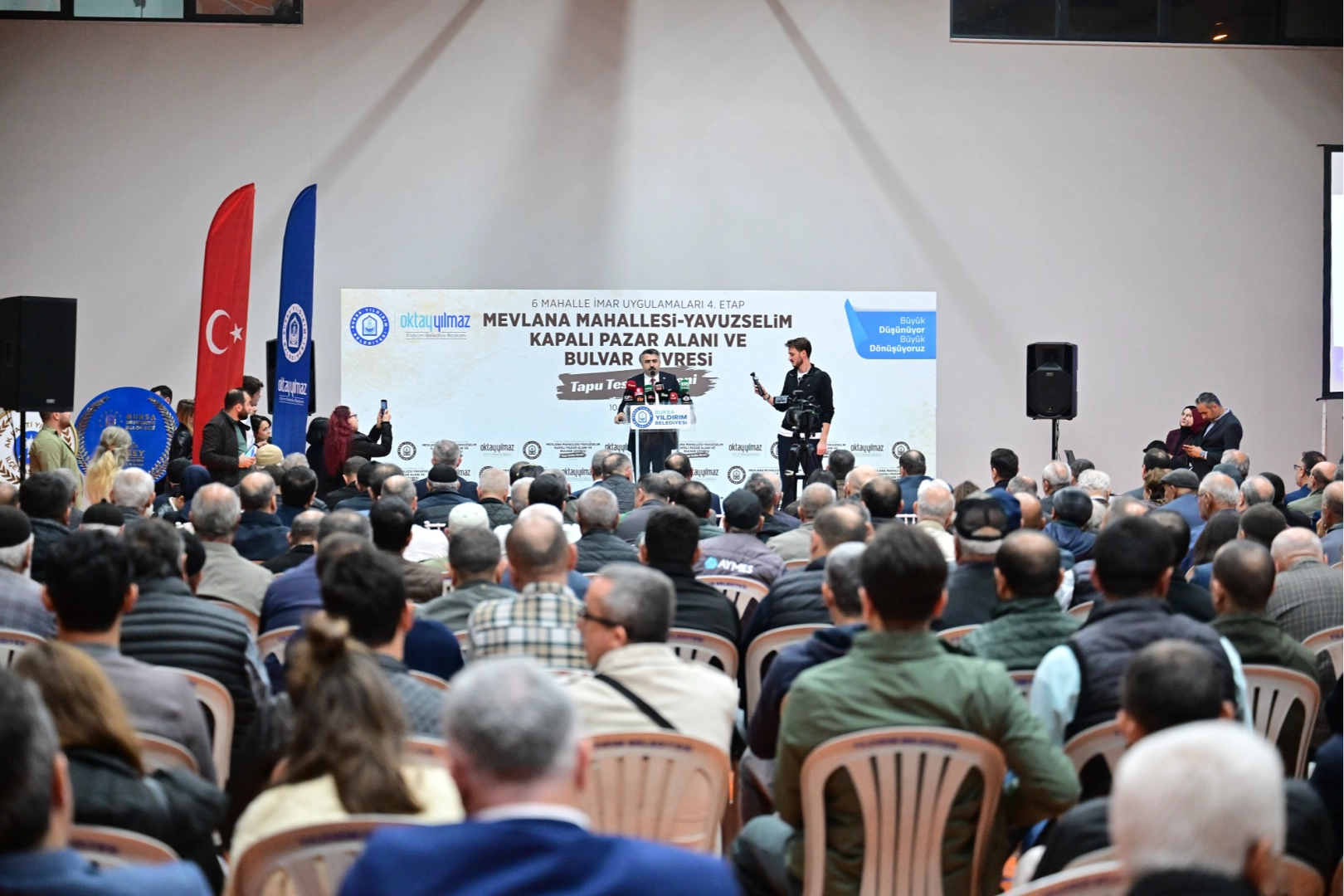 Yıldırım Belediyesi, 6 Mahalle İmar Uygulamaları 4. Etap kapsamındaki tapu çalışmalarını tamamlayarak, bin 550 hak sahibine tapularını dağıttı. Yunus Emre Spor Kompleksi'nde düzenlenen tapu dağıtım törenine Yıldırım Belediye Başkanı Oktay Yılmaz’ın yanı sıra AK Parti Yıldırım İlçe Başkanı İrfan Akkaya, AK Parti il yöneticileri, İlçe Tapu Sicil Müdürü Enes Gezmiş, Gençlik ve Spor İlçe Müdürü Mehmet Demirci, İlçe Müftüsü Nurullah Koçhan, meclis üyeleri, muhtarlar ve hak sahipleri katıldı.