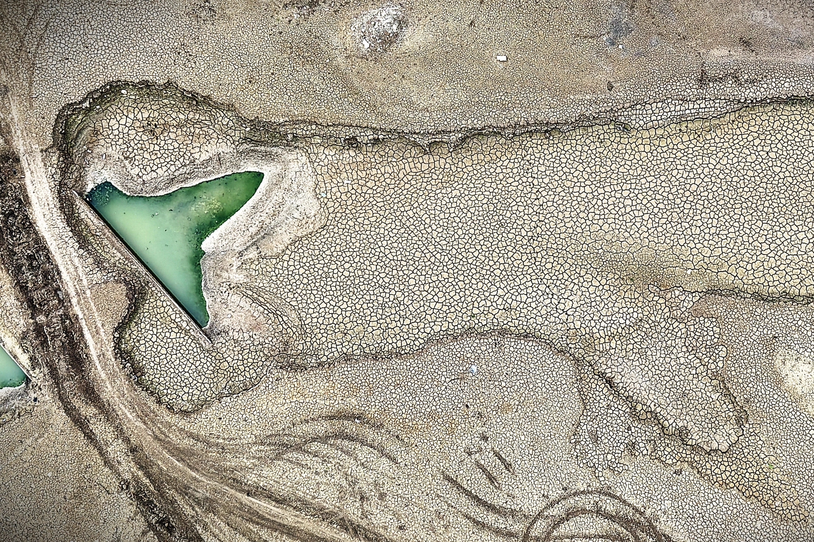 Dronla kaydedilen görüntülerde, iki baraj göletinde de suyun büyük oranda çekildiği, bazı noktalarda çekilmenin 300 metreyi bulduğu ve zeminde derin çatlakların oluştuğu görülüyor.
