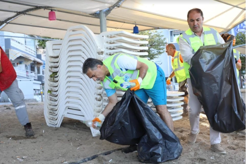 Mudanya Belediye Başkanı Deniz Dalgıç'ın ardından Gemlik Belediye Başkanı Şükrü Deviren, Başkan Yardımcıları Durmuş Uslu ve Arzu Şen Karataş, Özel Kalem Müdürü Bahadır Selvi, başkan danışmanları ve Temizlik İşleri Müdürlüğü personeli ile birlikte sabah erken saatte Kumla sahilinde plaj temizliği gerçekleştirdi.