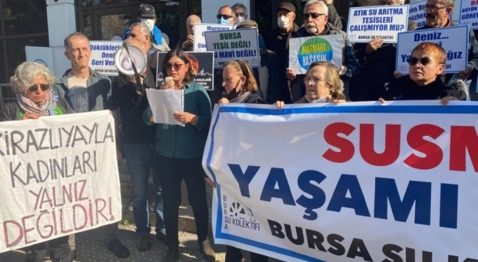 Bursa Su Kolektifi, Çevre, Şehircilik ve İklim Değişikliği İl Müdürlüğü önündeki basın açıklamalarının 6'cısını gerçekleştirdi. Kolektif üyeleri, bu ay basın açıklamasına "Su çürüdü" diyerek başladı. Marmara Denizi'nin atık deposu gibi kirletilmesinden dolayı suyun çürüdüğünü dile getiren kolektif üyeleri, Bakanlığa verdikleri dilekçelerden Marmara Denizi'nin korunmaya alınacağını öğrendiklerini bildirdi. Bursa Su Kolektifi, Karacabey Canbalı Deresi'nde yaşanan toplu balık ölümlerine bu yıl da tanık olduklarını belirtti.