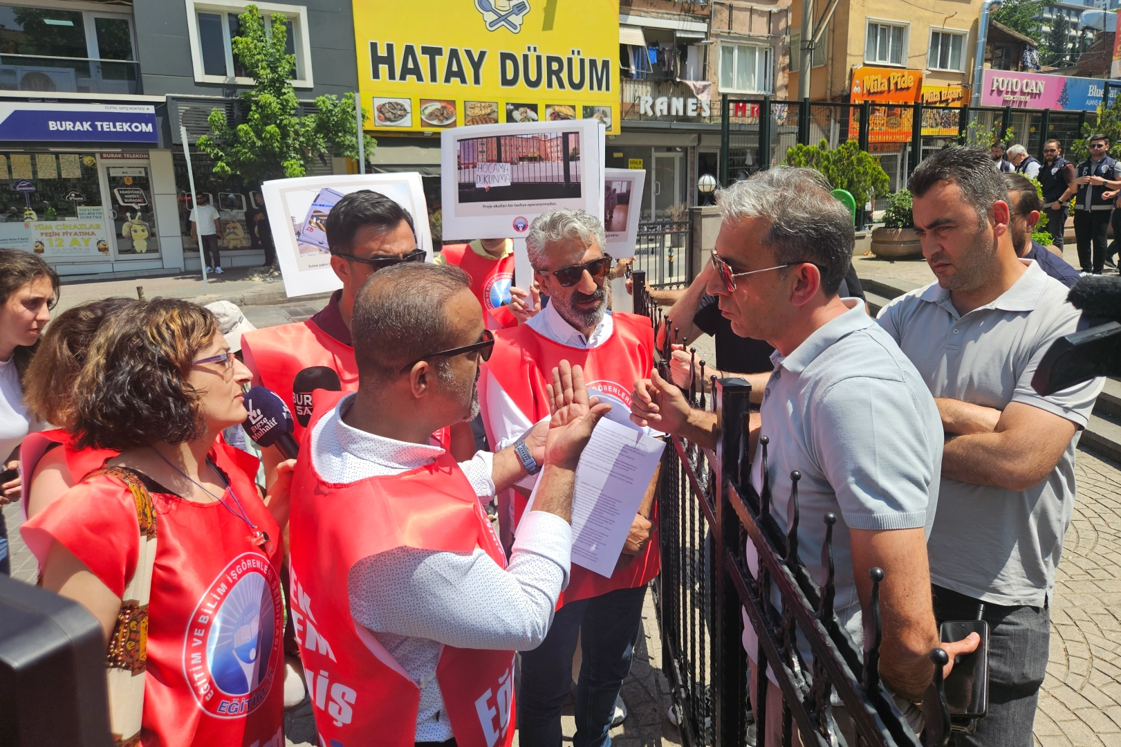 Eğitimcilerin saat 14.00'te yapacağı basın açıklaması için İl Milli Eğitim Müdürlüğü bahçesine girmeleri İl Milli Eğitim Müdürü Ahmet Alireisoğlu'nun talimatıyla engellendi.
