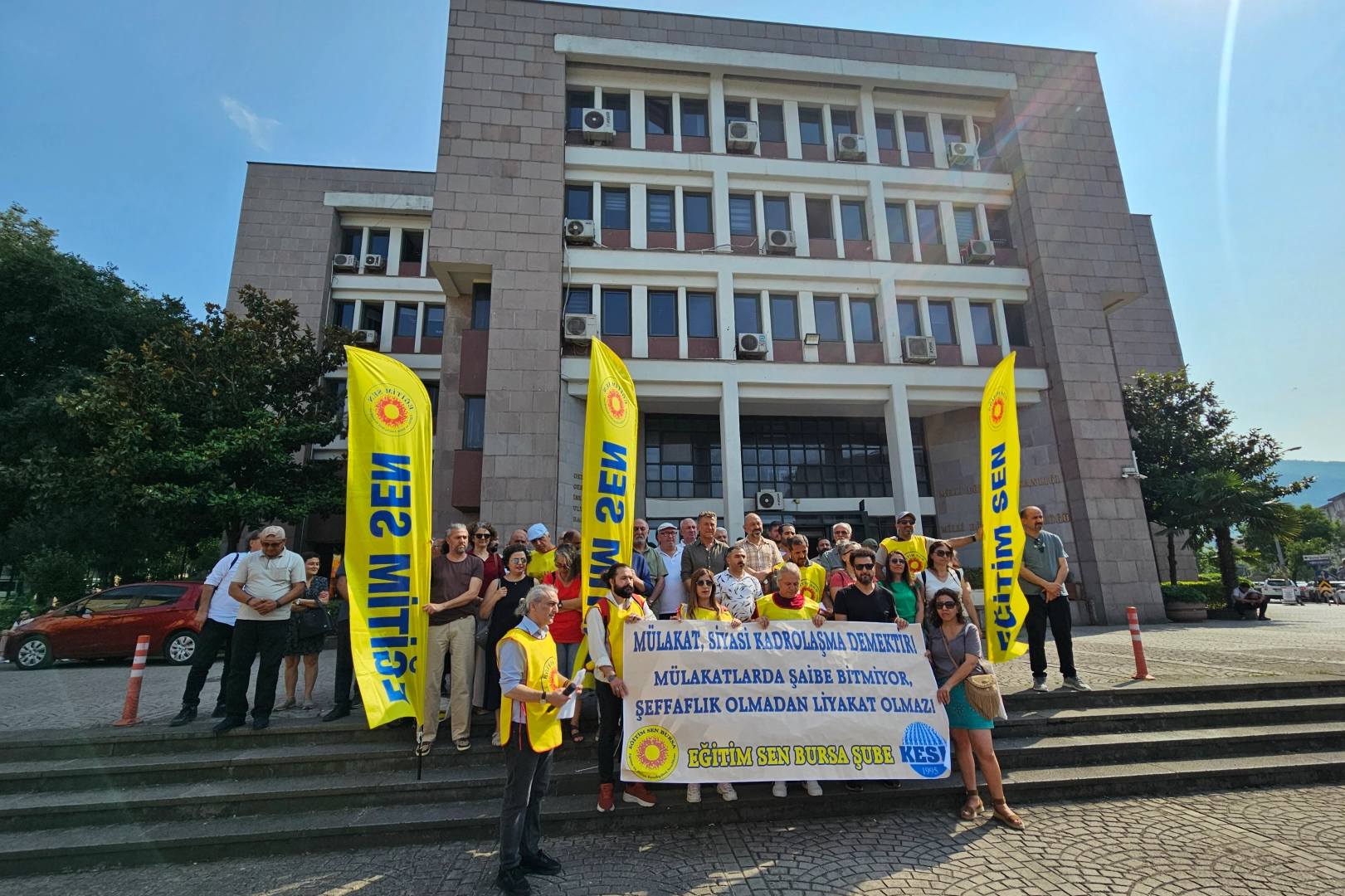 Eğitim Sen Bursa Şubesi, Milli Eğitim Bakanlığı’nın (MEB) uyguladığı mülakat sistemine karşı Milli Eğitim İl Müdürlüğü önünde bir basın açıklaması yaptı. Şube Başkanı Derviş Erdem tarafından okunan açıklamada, mülakatların yıllardır binlerce aday öğretmen ve yönetici adayını mağdur ettiği, sistemin liyakatsizliği ve siyasal kadrolaşmayı kurumsallaştırdığı vurgulandı.