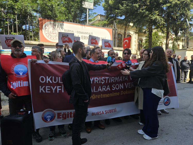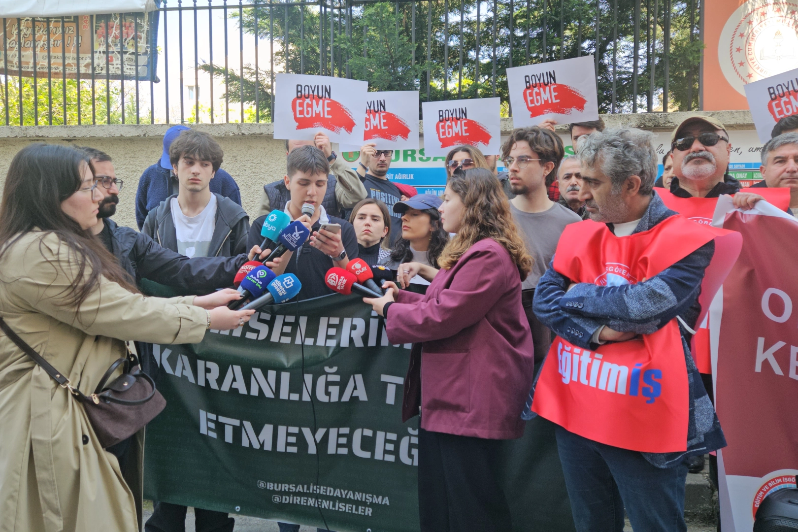 Eğitim İş Bursa Şube Başkanı Özkan Rona, "Okulları tarihinden, köklerinden ve kültüründen koparmaya çalışıyorlar. Bu köklü okullardan birisi de Bursa Erkek Lisesidir. Bu okul yalnızca bir eğitim binası değil aynı zamanda bir kültür mirası, bir düşünce ocağı ve Cumhuriyetin aydınlanma çabalarının somut bir temsilidir. Emperyalizme karşı yürütülen bağımsızlık savaşında bu okulun öğretmen ve öğrencileri Milli Mücadele'ye aktif olarak katılmışlardır. Hatta okul binası düşman güçlerince karargah olarak kullanıldığında bile Bursa Erkek Lisesi'nin direniş ruhu hiç sönmemiştir. İşgalcilere teslim olmayan Bursa Erkek Lisesi, tarikatçılara da teslim olmayacaktır. Edebiyattan spora, bilimden sanata kadar birçok alanda önemli isimler yetiştirmiş, sıralarında Ahmet Hamdi Tanpınar'ların yetiştiği, kürsüsünden Reşat Nuri Güntekin'lerin öğretmenlik yaptığı bu okulun öğretmenleriyle birlikte kültürü ve birikimi ile tasfiye edilmek isteniyor. Bu tasfiyenin sahibi olan altında gizli imzaları bulunan tarikatlerden, cemaatlerden, yandaş sendikadan aldıkları listelerle öğretmenleri tasfiye eden bu yandaş yöneticiler, biraz önce de Bursa Erkek Lisesi'nin öğrencilerini buraya yanaşmamaları için okul binasına hapsetmişlerdir" diye konuştu.