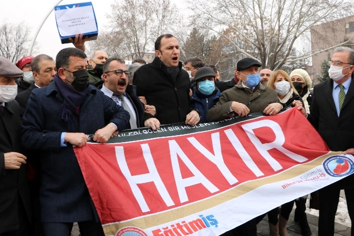 Eğitim-İş Genel Başkanı Kadem Özbay, Meclis kapısı önünde açıklama yaptı. Özbay, “Öğretmenleri ilgilendiren bir meslek kanunu Meclis’te görüşülüyor. Ne Meclis’in önünde ne de içerisinde bir söz söylememize tahammül edilemiyor. Kendi yandaşlarınızla büyüttüğünüz sendikayı da alın yanınıza, eğer bir kişi bu kanuna sahip çıkarsa gerçekten başka söze de gerek kalmayacak. Kimsenin kabul etmediği, 12 maddeye sıkıştırılmış, bir teneffüs aralığında hazırlanabilecek, öğretmenleri kategorize eden, ayrıştıran ve en tehlikelisi idareye birçok yetkiyi devreden tekliften bahsediyoruz. Bu taslak bu haliyle hem iş güvencemizi tartışılır hale getirecek hem de iş barışını bozacaktır.” diye konuştu.