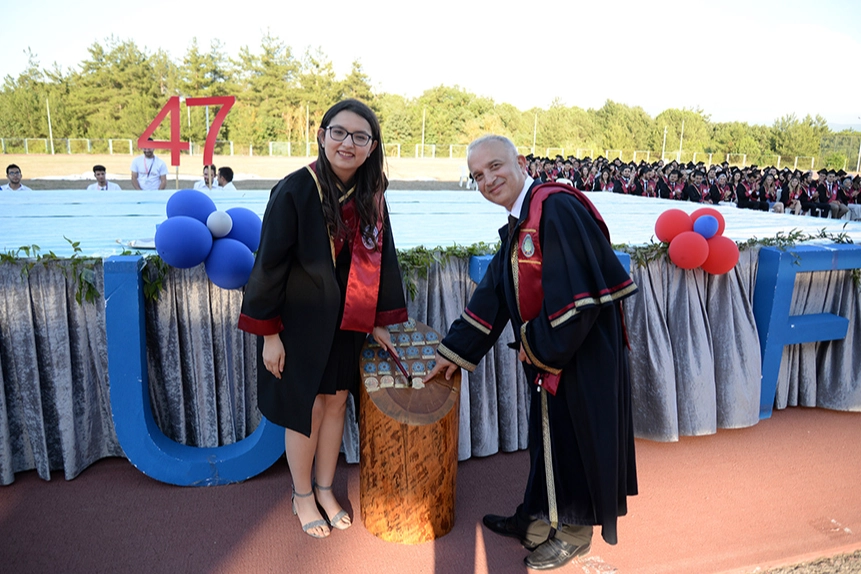Bursa Büyükşehir Belediye Başkan Vekili ve Bursa Tabip Odası Başkanı dereceye giren öğrencilere hediyeler verirken, 47. Dönem Birincisi olan Dr. Berfin Nazlı Torun Tıp Fakültesi Dekanı Prof. Dr. Ekrem Kaya ile birlikte yaş kütüğüne plaket çaktı. Tören, mezun öğrencilerin anı belgelerini almaları ve kep fırlatmalarının ardından sona erdi.