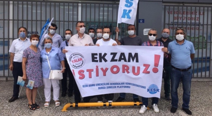 Bursa KESK Şubeler Platformu, 14 Temmuz Salı günü Ataevler Vergi Dairesi önünde "Ek zam istiyoruz!" talebiyle basın açıklamasında bulundu.