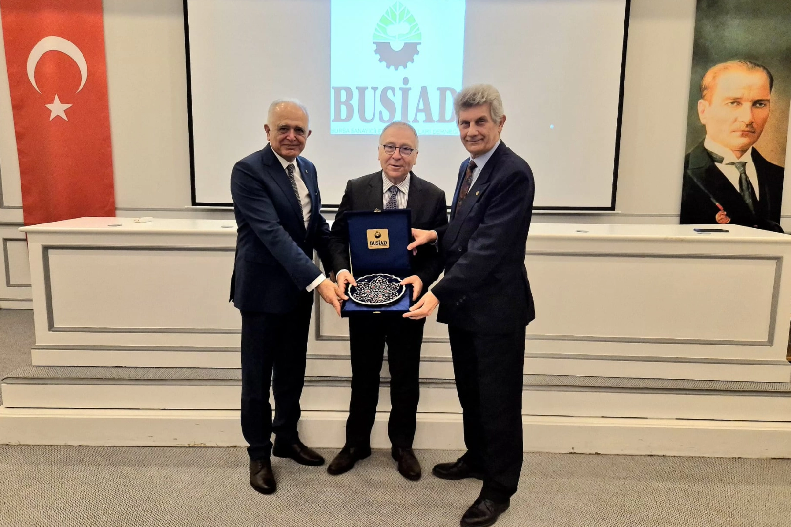Seçimin ardından yeni BUSİAD YDK Başkanı Buğra Küçükkayalar ile BUSİAD Yönetim Kurulu Başkanı Tuncer Hatunoğlu, Ergun Hadi Türkay’a anı tabağı hediye ettiler.