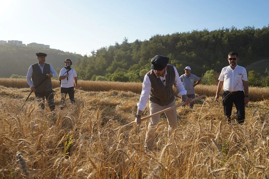 Çataltepe Mahallesi'nde gerçekleşen ilk hasat etkinliğine katılan Kestel Belediye Başkanı Önder Tanır, AK Parti Bursa milletvekilleri Mustafa Yavuz ve Ahmet Kılıç, giydikleri çiftçi kıyafetleriyle ilk buğdayları tırpanlayarak traktöre yükledi.