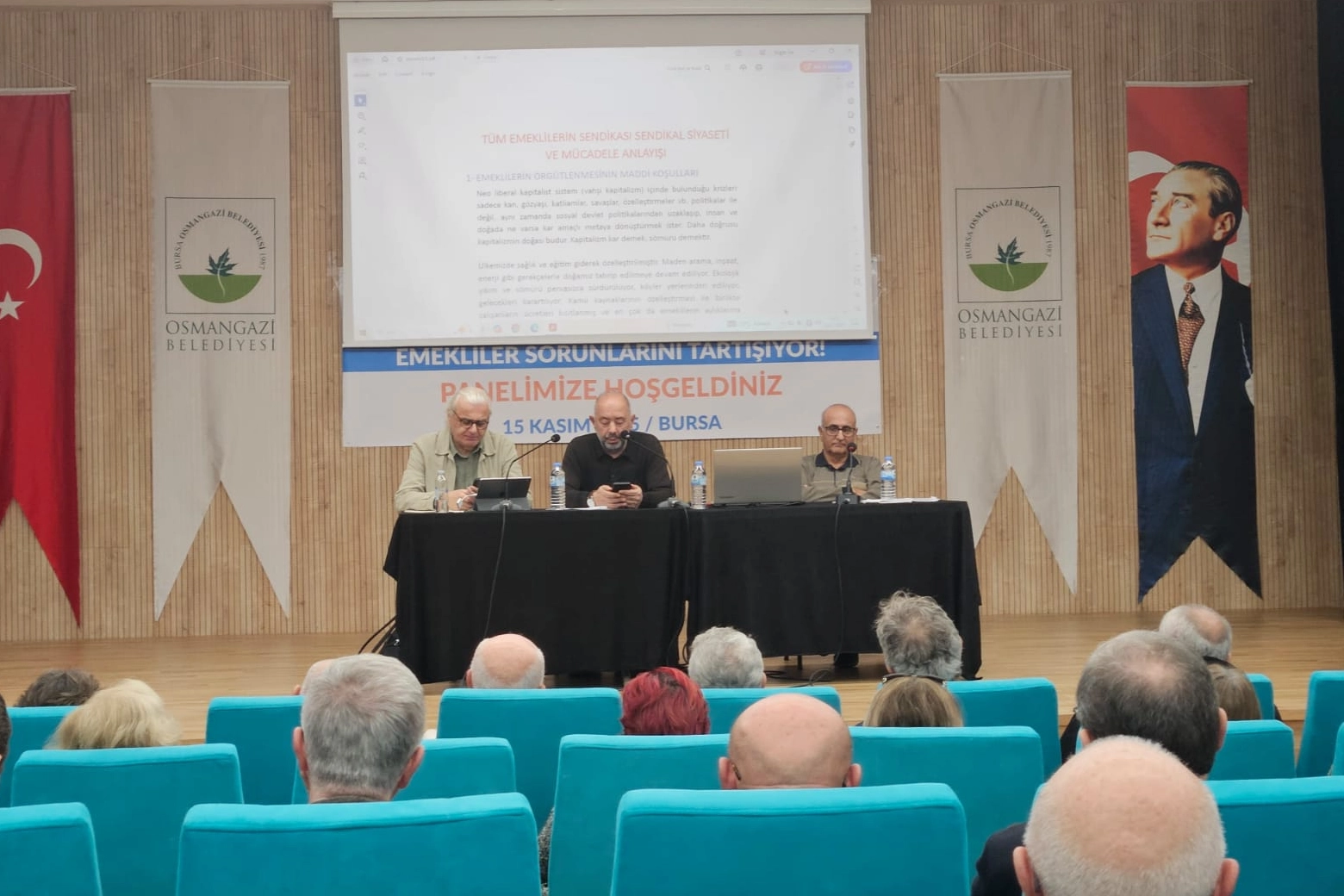 Tüm Emeklilerin Sendikası 2017 Bursa Şubesi tarafından düzenlenen panelde, emeklilerin giderek ağırlaşan ekonomik koşulları, örgütlenme süreci ve sosyal güvenlik sisteminin durumu ele alındı. Panelin kolaylaştırıcılığını ESM Bursa Şube Başkanı Uğur Üçöz yaptı.