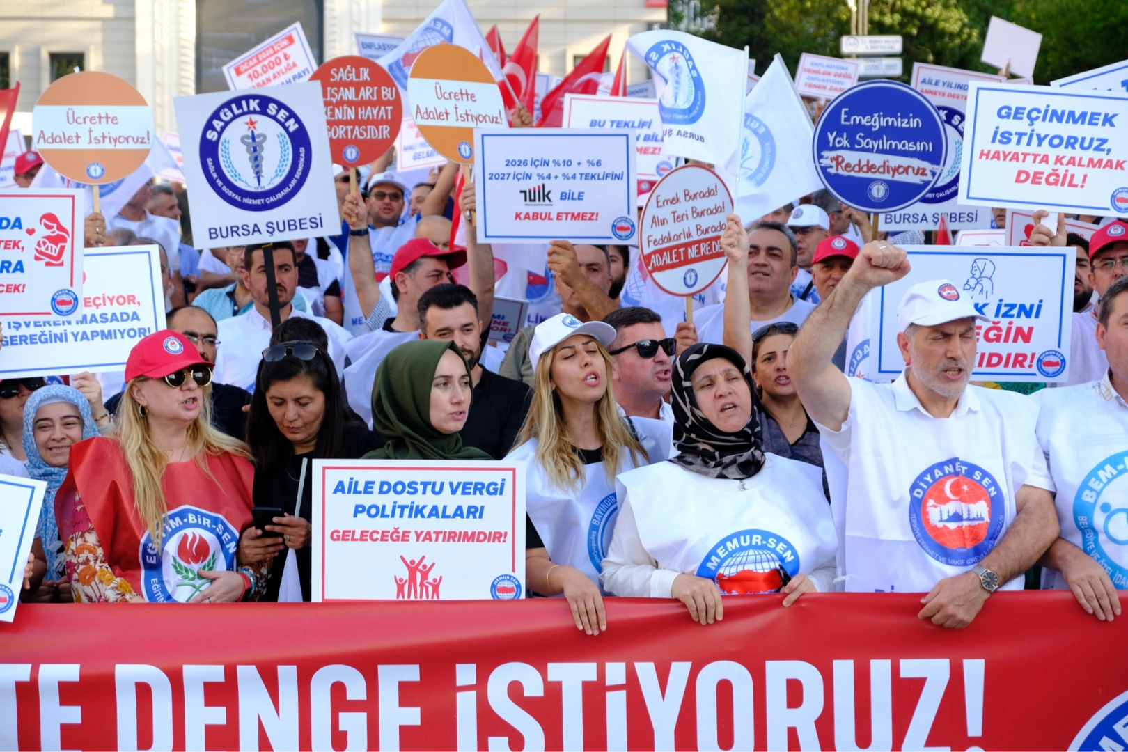 Memur-Sen Bursa İl Temsilciliği, 8. Dönem Toplu Sözleşme görüşmelerinde, Kamu İşvereni’nin sunduğu teklife karşı; tepki göstermek için meydanlara indi. 15 Temmuz Demokrasi Meydanı’nda basın açıklaması gerçekleştiren Memur-Sen Bursa İl Temsilcisi ve Eğitim-Bir-Sen Bursa 1 Nolu Şube Başkanı Ramazan Acar, “Kamu işvereni dün açıkladığı teklifte 2026 için %10 + %6, 2027 için %4 + %4 zam önerisinde bulundu. Öncelikle; İşveren Heyeti’nin bu teklifini yok saydığımızı ve gerçekçi bulmadığımızı belirtiyoruz; görüyoruz ki işveren, tutmayan enflasyon hedeflerini baz alarak kamu görevlisine bu teklifi layık görmüştür. İşverenin teklifinde; refah payı ve taban aylığa zam yoktur. Gelirde adaleti sağlayacak oran yoktur. Emekli ve emekçiyi gözeten bakış yoktur. Kamu işvereninin bu teklifi; memur ve memur emeklisinin yaşadığı zorlukların görmezden gelindiğini gösteriyor. Teklif, kamu görevlilerinde hayal kırıklığı oluşturmuştur.” dedi.