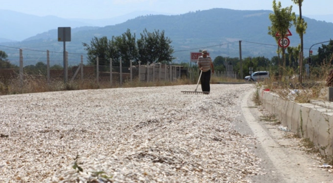 Tarlalardan toplanan "İnegöl alası" üreticiler tarafından kurutulmak üzere Ahmet Türkel Çevre Yolu'nun bir bölümüne serildi.