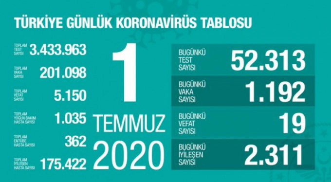 Sağlık Bakanlığının internet sitesinde yer alan ve Bakan Fahrettin Koca'nın Twitter'dan paylaştığı "Türkiye Günlük Koronavirüs Tablosu"nun güncel verilerine göre, bugün 52 bin 313 test yapıldı, 1192 kişiye Kovid-19 tanısı konuldu. Son 24 saatte 19 hasta vefat etti, 2 bin 311 kişi iyileşti.