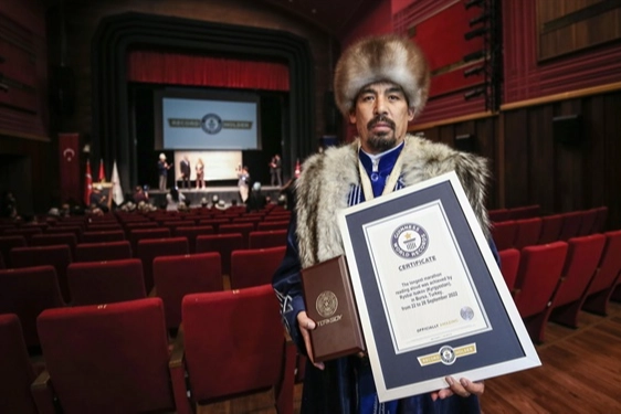 Merinos Parkı'nda kurulan çadırda Manasçı Rısbai İsakov, rekor hedefi için günde 20 saatten fazla ezbere Manas Destanı'nı okudu.