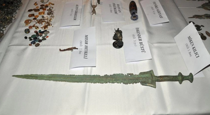 Operasyonda ele geçirilen tarihi eserler arasında, Yunan mitolojisinin en önemli savaşçısı Aşil'in (Akhilleus) kılıcı olarak bilinen yaklaşık 3 bin yıllık Miken kılıcı ile Büyük İskender'in Hindistan seferi sırasında yaptırdığı "İskender Büstü", mitolojik dönem Yunan tanrısı Hermes heykeli ve Helenistik döneme ait altın yapraklarında "Tanrı Heilos" figürleri olan taç bulunduğu belirtildi.