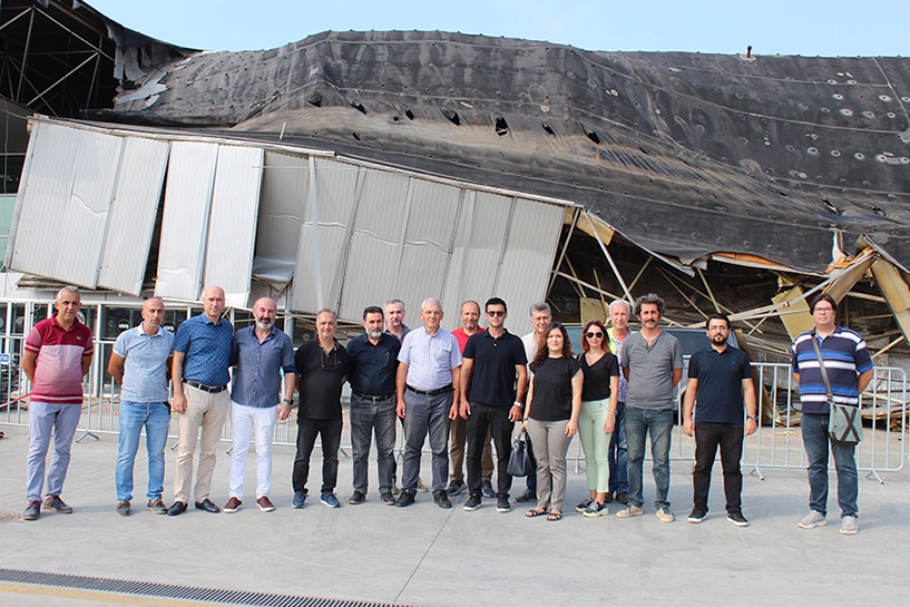 Bursa’da bazı ilçelerde sele neden olan yoğun yağış sırasında yıldırım düşen Bursa Şehirlerarası Otobüs Terminali’nin çatısı da çöktü. Konu ile ilgili olarak termalin çöken kısımlarını incelemek için TMMOB Bursa İl Koordinasyon Kurulu Sekreteri ve Mimarlar Odası Bursa Şube Yönetim Kurulu Başkanı Şirin Rodoplu Şimşek, İMO Bursa Şubesi Yönetim Kurulu Sekreter Üyesi Emrah Mutlu, İMO Bursa Şube Teknik Komisyon Başkan Yardımcıları Uğur İnal, Şükrü Şahin, Komisyon üyeleri Berker Turan, Recep Tek, Araz Kebir, Şube Sekreteri Bedirhan Karagöz, Mimarlar Odası Bursa Şubesi Yönetim Kurulu ve Elektrik Mühendisleri Odası Bursa Şubesi Yönetim Kurulu Temsilcileri olay yerine gitti. Terminal İşletme Müdürü Şeref Ayerdem’den de bilgi alan ekip çökmenin neden olduğu ve nasıl başladığını tespit etmek için ön incelemelerde bulundular.