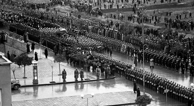 "İSTANBUL: 16 (A.A) - Bu sabah saat 10'dan itibaren Dolmabahçe Sarayı'nda Büyük Şefin cenazesi huzurunda halkın son ihtiram geçidi başlamıştır. Daha erkenden Saray civarındaki bütün yollarda münakalat durmuş, kadın erkek on binlerce halk sokakları doldurmuş bulunuyordu. Hıçkırıklarını saklamayan bu halk kütlesinin matemi yüzlerinde asil bir ızdırabın gölgesi vardı.