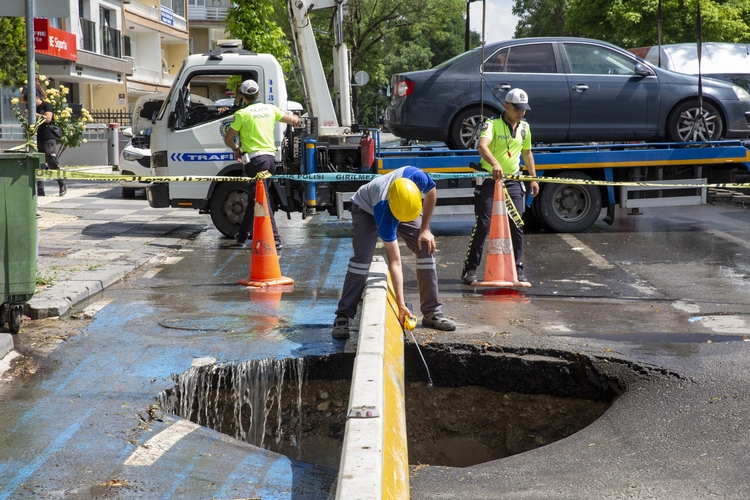 Bölgedeki trafik polisleri, yolun çöken bölümünün etrafına güvenlik şeridi çekti. Ardından olay yerine itfaiye ve doğal gaz ekipleri geldi. Caddede geniş bir çukur oluştu. Çöken yolun yakınındaki araçlar çekiciyle kaldırıldı.
