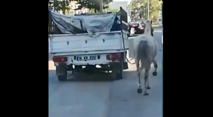 Bursa kent merkezinde bir sürücünün 16 KT 935 plakalı kamyonetin arkasına bağladığı atla ilerlediğini gören vatandaşlar o anları cep telefonu kamerası ile kayda aldı.