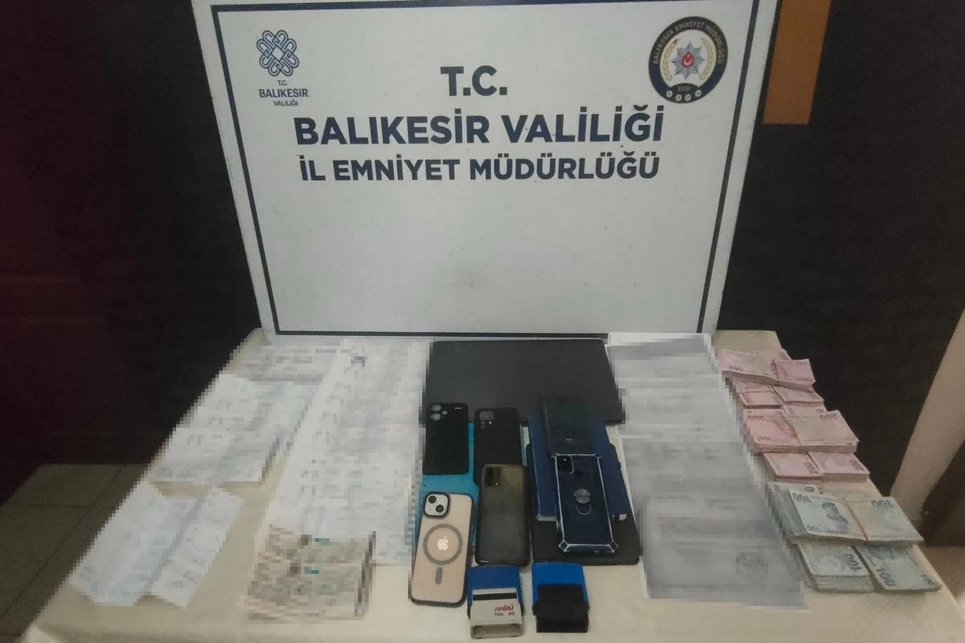 Şüphelilerin ikametlerinde ve iş yerlerinde yapılan aramalarda, suçla ilişkili olduğu değerlendirilen 28 milyon 100 bin Türk Lirası tutarında çek ve senet, 150 bin Türk Lirası nakit para, suça dair bilgilerin yer aldığı ajandalar, dijital materyaller, çeşitli sözleşme, dekont ve dokümanlar ile kaşeler ele geçirildi.