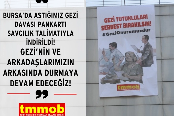 İş insanı Osman Kavala'nın ağırlaştırılmış müebbet hapisle cezalandırıldığı Gezi Davası kararı sonrası tutuklanan 7 kişiye ve Gezi Parkı protestolarına destek vermek amacıyla TMMOB tarafından Bursa Akademik Odalar Birliği (BAOB) binamıza asılan “Gezi Tutukluları Serbest Bırakılsın, Gezi Onurumuzdur” yazılı pankart akşam saatlerinde Bursa Cumhuriyet Savcısının talimatıyla indirildi.