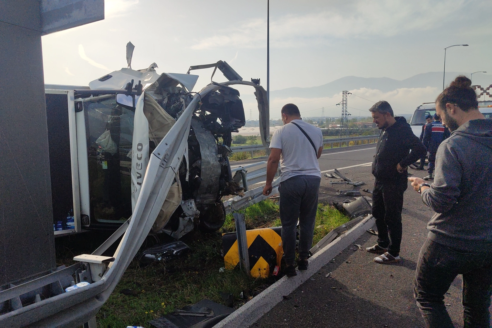 İstanbul-İzmir Otoyolu'nda seyreden Muhammet Şükrü Öztürk (38) idaresindeki 35 AVC 716 plakalı kamyonet, Orhangazi Kavşağı'nda yön levhalarının bulunduğu bölümü yoldan ayıran bariyere çarpıp parçalayarak devrildi.
