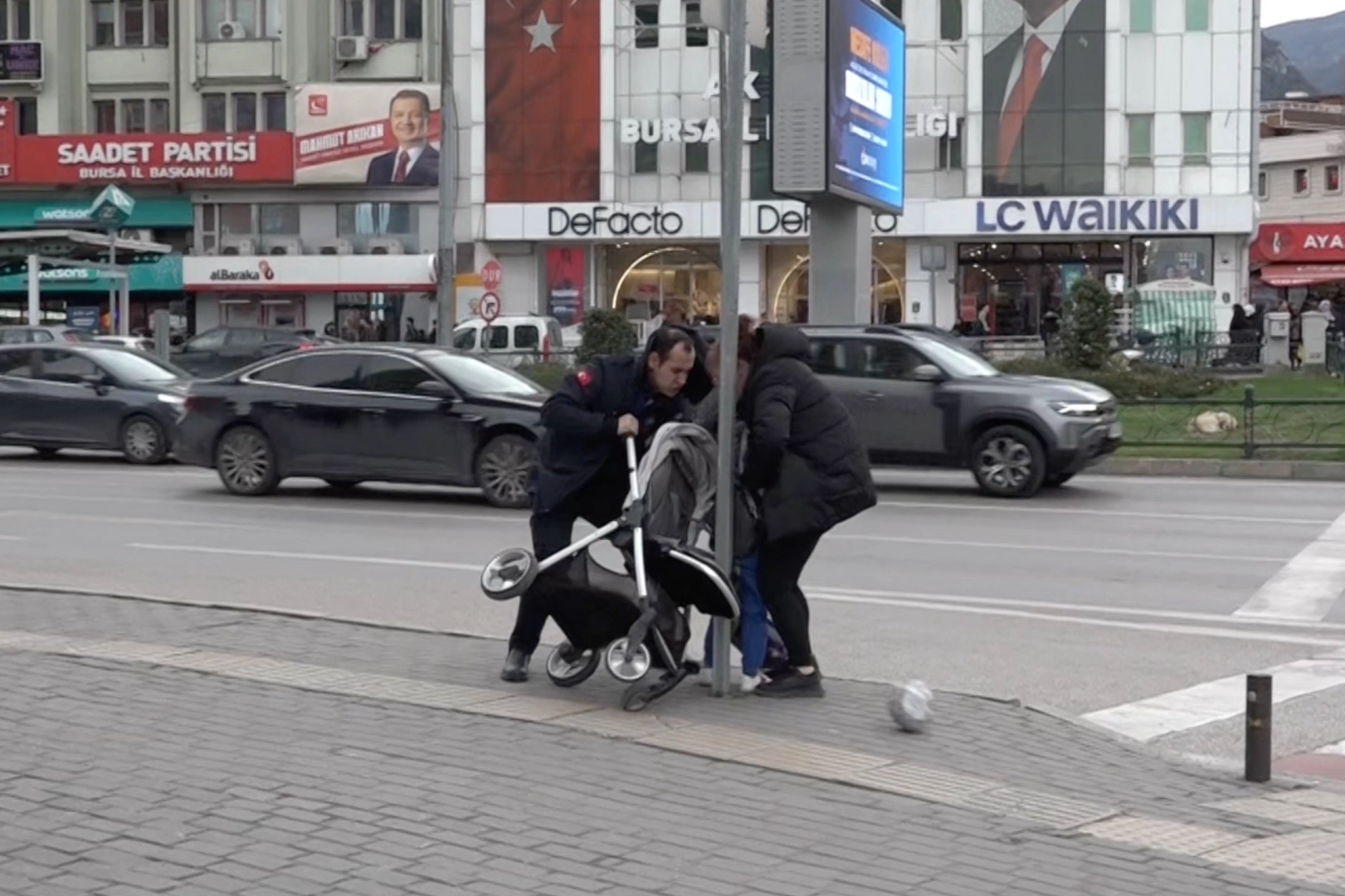 Bursa'da etkili olan şiddetli lodos, sokakta yürüyen vatandaşlara zor anlar yaşattı. Kuvvetli rüzgârın etkisiyle bebek arabasıyla yürüyen bir ailenin elinden kurtulan bebek arabası yan yattı. Bebeğe bir şey olmazken, arabanın altındaki malzemeler yola saçıldı. Bir vatandaşın ise uçmamak için direğe tutunduğu görüldü.