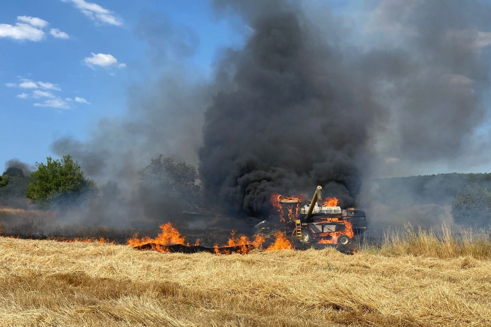 Bursa'nın Harmancık ilçesine bağlı Okçular Köyü'ndeki bir buğday tarlasında hasat sırasında henüz bilinmeyen nedenle biçerdöver alev aldı.
