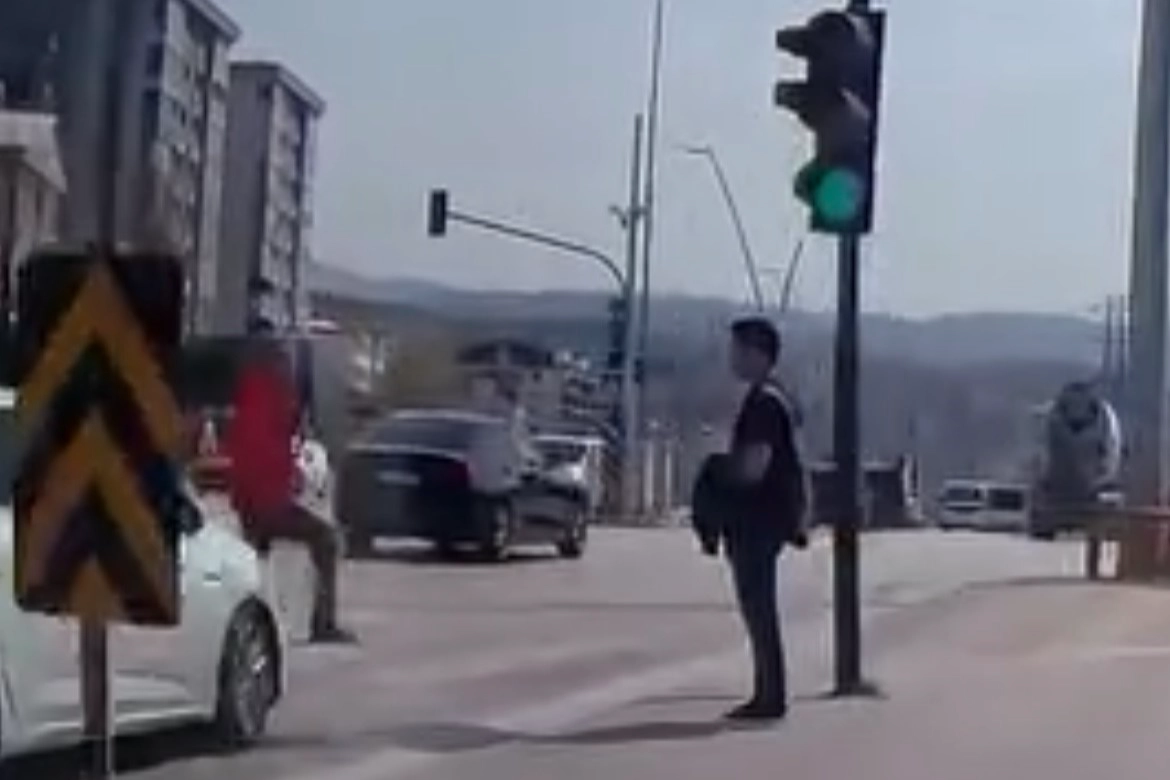 Bursa'nın Nilüfer ilçesinde trafik ışıklarının araçlara yeşil yandığı sırada karşıya geçmek isteyen bir yaya, akan trafiğe aldırış etmeden yola çıktı. O esnada seyir halinde olan bir otomobil, aniden önüne çıkan yayaya çarpmamak için manevra yaptı. Kazanın eşiğinden dönülen olayda, yaya son anda attığı adımla aracın altında kalmaktan kurtuldu.