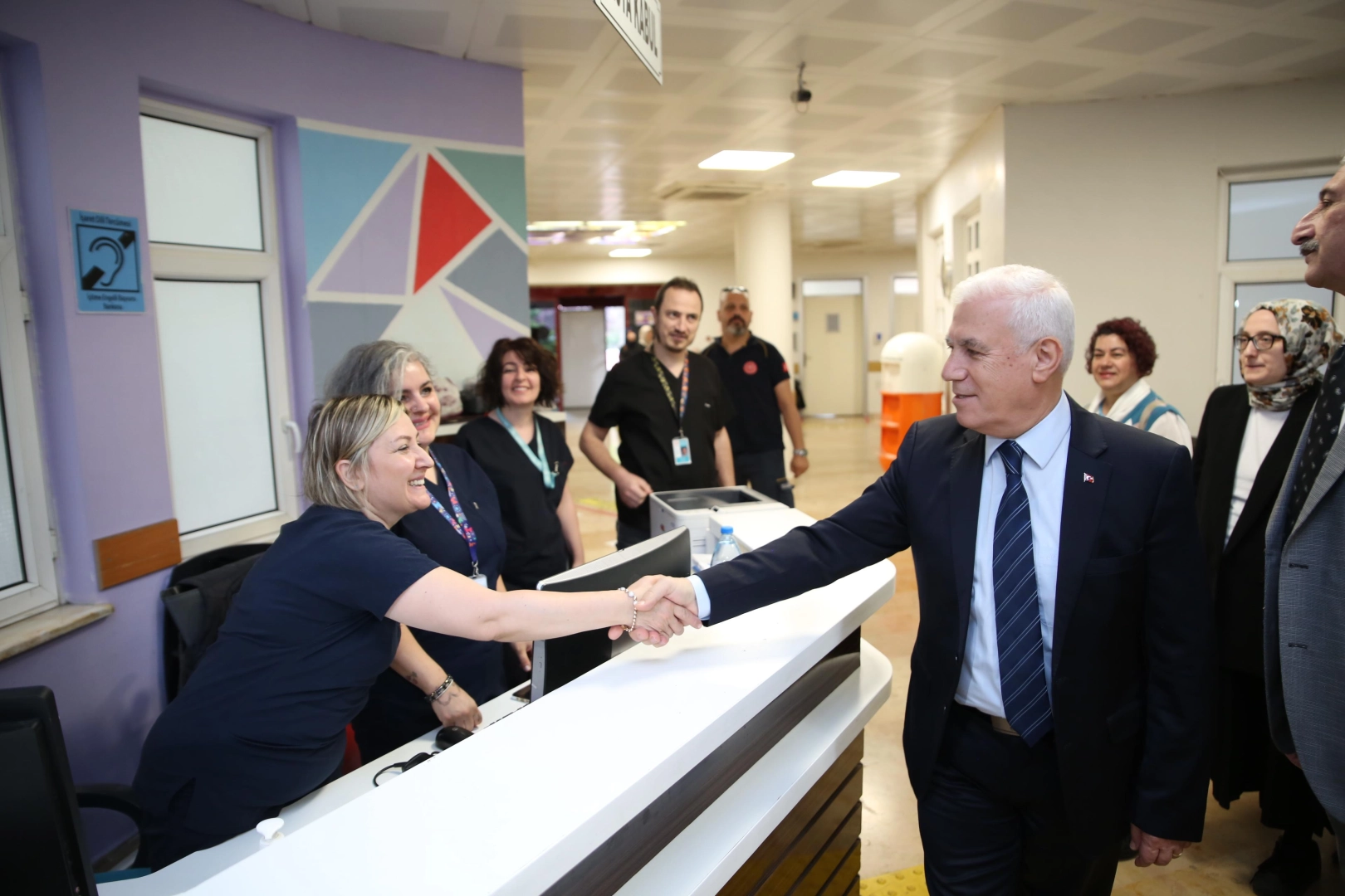 Bursa Büyükşehir Belediye Başkanı Mustafa Bozbey, Ali Osman Sönmez Onkoloji Hastanesi’nde ilk olarak Başhekim vekili Fatma Betül Orhan ve hastane yönetimiyle bir araya geldi. CHP İl Başkanı Nihat Yeşiltaş ile birlikte doktorları ve hemşireleri ziyaret eden Bozbey, sağlık çalışanlarının ‘Hemşireler Haftası’nı tebrik etti. Daha sonra tedavi gören hastalarla ve hasta yakınlarıyla buluşan Bozbey, tedavi süreçleri hakkında bilgi alarak geçmiş olsun dileklerini iletti. Sağlık personeline çalışmalarından dolayı teşekkür eden Büyükşehir Belediye Başkanı Mustafa Bozbey, “Tedavi gören hastaların, sağlık çalışanlarından memnun olduğunu görmek bizleri sevindirdi. İnşallah hepsi kısa zamanda eski sağlığına kavuşacaktır. Hastanede görevli arkadaşları da yürekten kutluyorum. Büyük bir özveriyle çalışıyorlar. Sağlık sektöründe çalışan tüm güzel insanlara selam olsun” dedi.