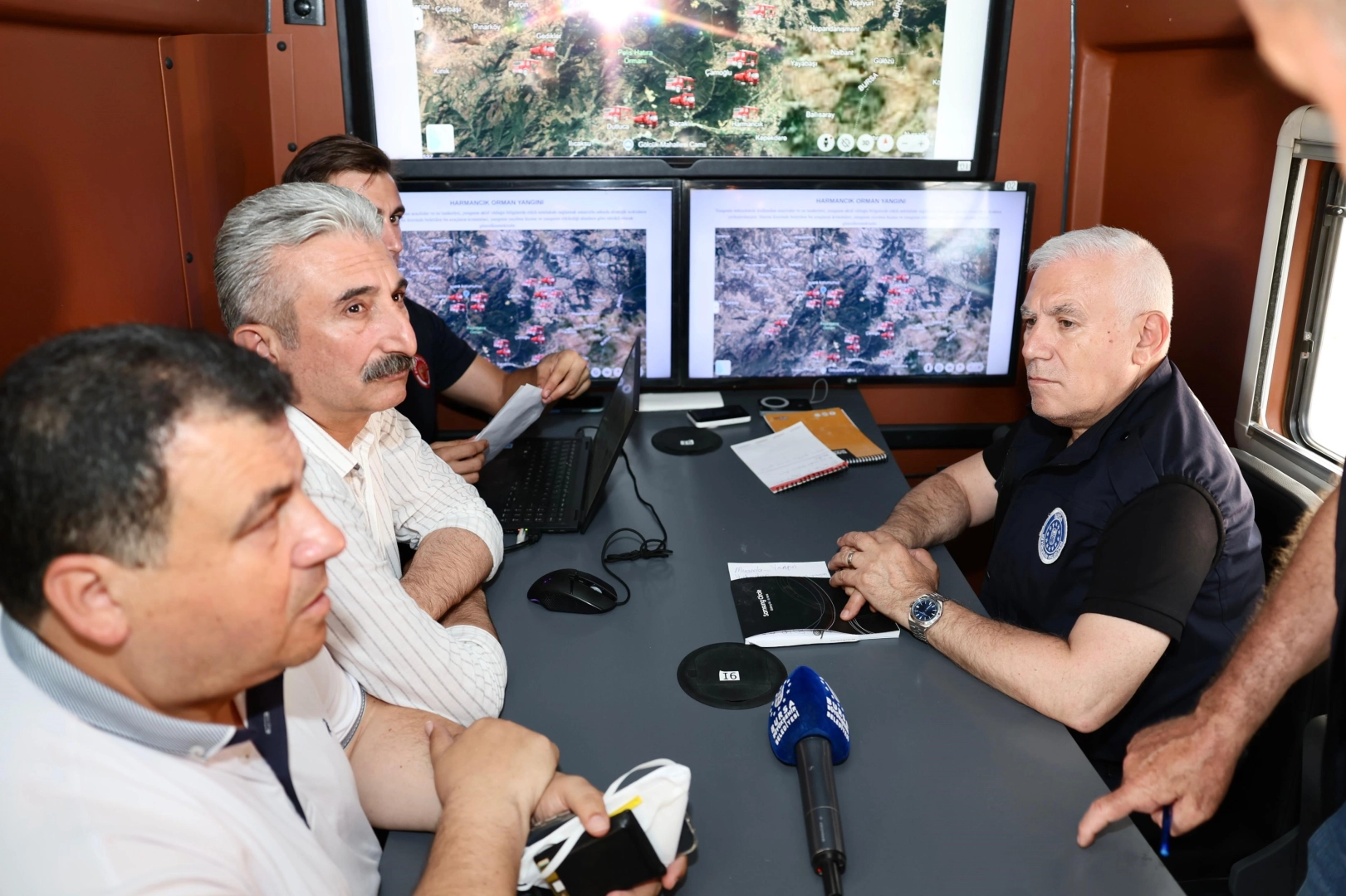 Bursa’nın Harmancık ilçesindeki yangın akşam saatlerinde yeniden alevlenirken, Bursa Büyükşehir Belediyesi itfaiye teşkilatı başta olmak üzere Orman Bölge Müdürlüğü, kamu kurumları, büyükşehir belediyeleri, ilçe belediyeleri, sivil toplum kuruluşları ve vatandaşların iş birliğiyle söndürme çalışmaları aralıksız sürdürülüyor. Bursa Büyükşehir Belediye Başkanı Mustafa Bozbey de beraberindeki CHP İl Başkanı Nihat Yeşiltaş, CHP Bursa Milletvekili Hasan Öztürk ve belediye yöneticileriyle birlikte Harmancık ilçesine geçerek çalışmaları yerinde inceledi. Sahada gece gündüz demeden görev alan ekiplere kolaylıklar dileyen Başkan Bozbey, AKOM aracına geçerek drone aracılığıyla alanı gözlemledi ve son durum hakkında bilgi aldı.