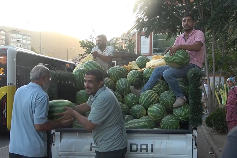 Bursa'da bir zücaciye mağazası sıcak yaz günlerinde bunalan vatandaşlara serinlemeleri için bedava karpuz dağıttı. Mağazaların önünde 4 kamyonette bulunan yaklaşık 20 ton karpuz kısa sürede tükendi.
