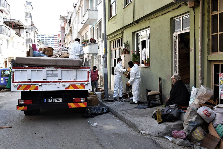 Alınan mahkeme kararıyla adrese giden Osmangazi Belediyesi Temizlik İşleri Müdürlüğü ve zabıta ekipleri, "çöp ev"den 2 kamyon dolusu eşya çıkardı.