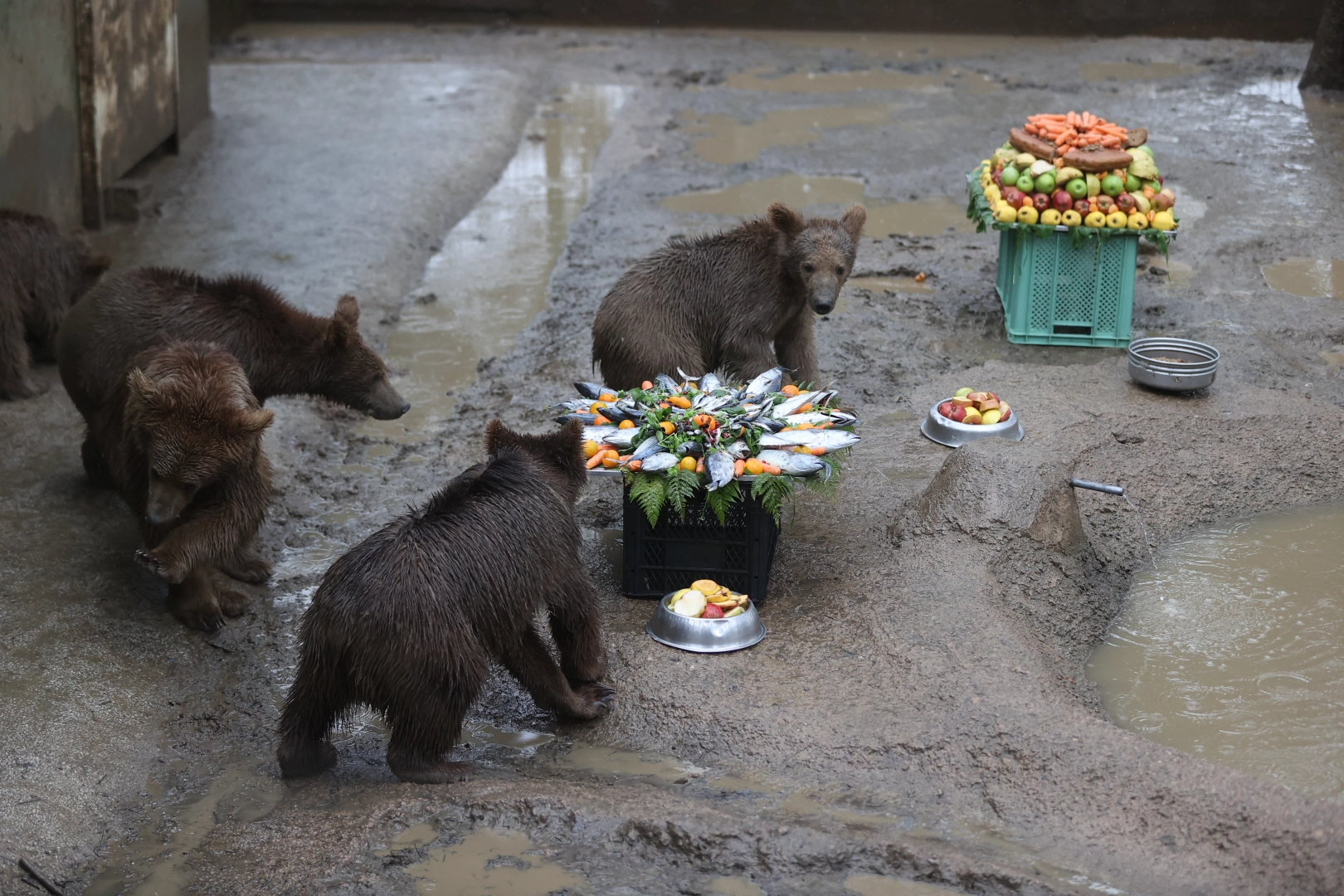 Temsili doğum günü kutlamasında, balık, reçel, sebze, meyve ve besin değerli yüksek çeşitli ürünlerle hazırlanan pasta görünümlü yiyecekler, özel olarak ayılara verildi.