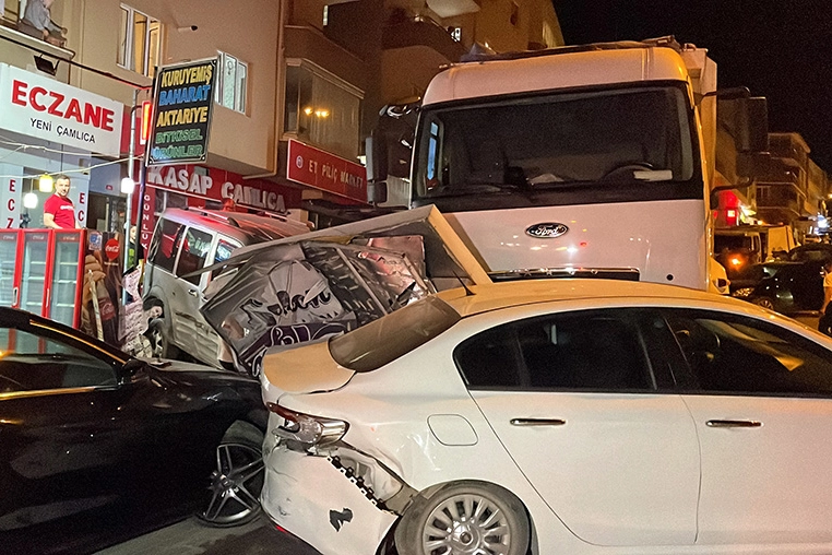 Un indirildiği sırada freni boşalan kamyon, önce yoldaki uyarı levhasına çarptı. Daha sonra yokuş aşağı park halindeki otomobillere çarparak ilerleyen kamyon, kaldırıma çıkarak durdu.