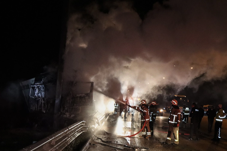 Alınan bilgiye göre, İstanbul-Bursa-İzmir Otoyolu Doğanköy mevkisinde, Ömer Faruk Erkoyuncu idaresindeki 34 NGG 57 plakalı et taşıyan kamyon, sürücüsünün direksiyon hakimiyetini kaybetmesiyle önce bariyerlere, ardından şehir yönlendirme direğine çarparak durdu. Çarpmanın etkisiyle alev alan araç yanmaya başladı.