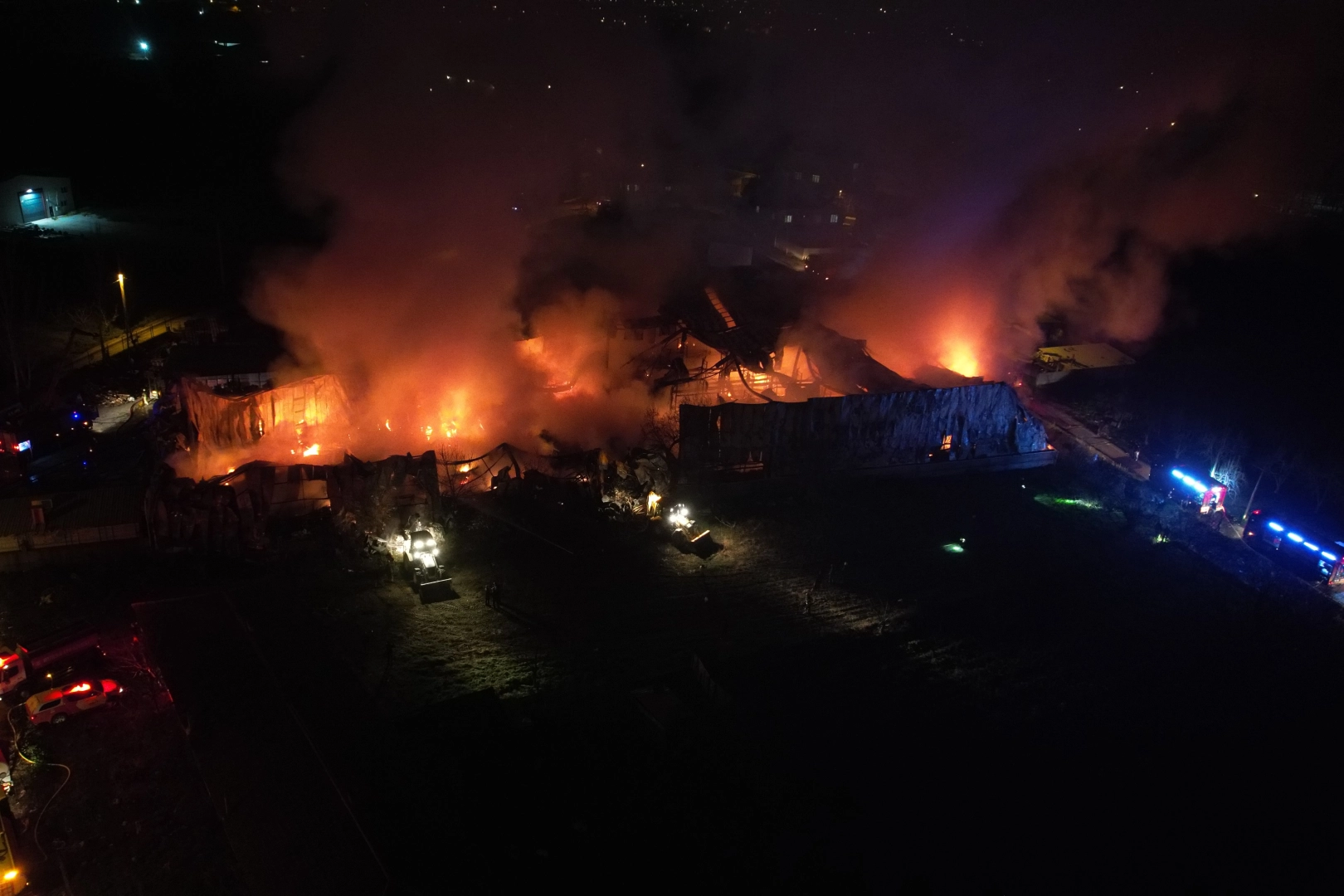 Öte yandan, geceyi aydınlatan alevler dron ile havadan görüntülendi. İtfaiye ekiplerinin yangını söndürme çalışmaları sürüyor.