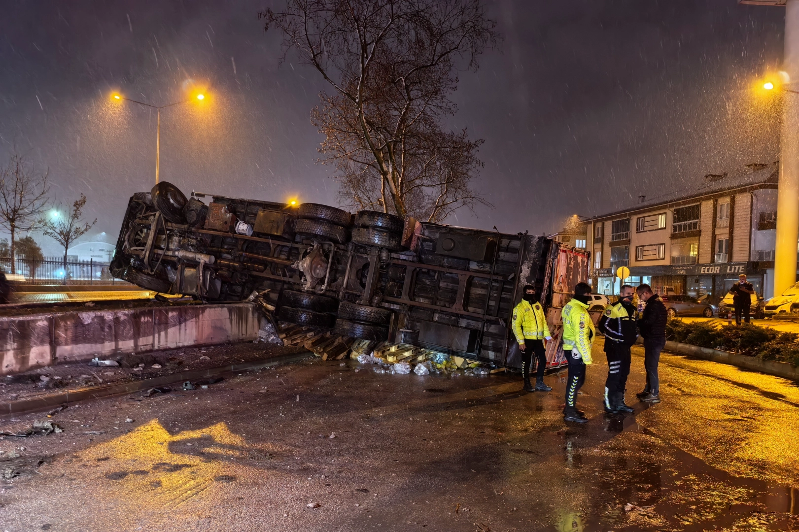 Kaza, saat 19.00 sıralarında Bursa-Ankara karayolu üzeri İnegöl girişinde meydana geldi. Bursa'dan İnegöl'e seyir halinde olan Bünyamin B. (47) idaresindeki 16 AVD 445 plakalı içecek yüklü kamyon, sürücüsünün kontrolünden çıkarak alt yola devrildi. Kazada sürücü yaralanmazken, dorsede bulunan tüm şişeler kırıldı. Araç çekici yardımıyla 2 saat süren çalışma sonucu kaldırıldı. Polis kaza ile ilgili soruşturma başlattı.