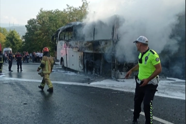 Yangını fark edince otobüsü hemen yol kenarına park eden şoför, yolcuları hızlıca araçtan inmesini sağladı.