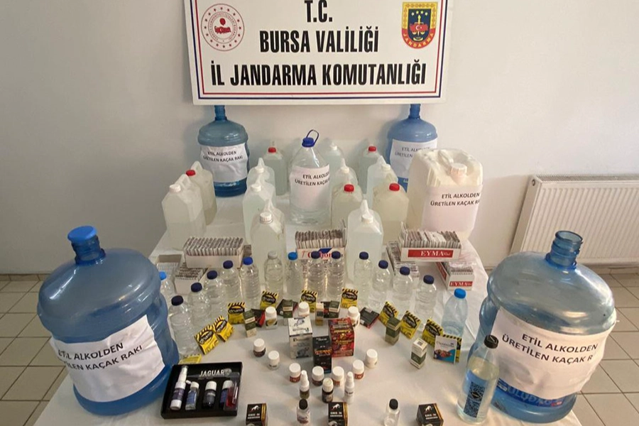Bursa İl Jandarma Komutanlığı ekipleri, Nilüfer ilçesi Unçukuru Mahallesi'nde M.K'nin (74), sahte alkollü içki üretip kendi işyerinde sattığı yönünde ihbar aldı.