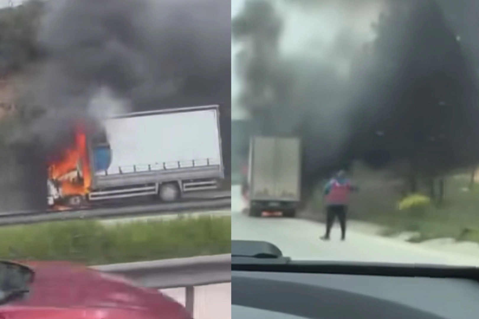 Kısa sürede büyüyen yangın kamyonu tamamen sararken, sürücü aracı yol kenarına çekerek kendini dışarı attı.